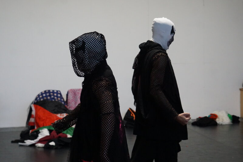 "This piece is about social injustice, climate crisis, queer struggles and celebration, and capturing the speedy far-right political take over of the world. This is brilliantly portrayed through a cluster of black coloured suits tied together and crawling and sliming across the stage. It soon rises in height and stations itself almost resembling a scare crow, in a powerful stance. But the show of seriousness and power soon subsides and turns to humour as we suddenly hear the non sensible, ridiculous statements from Trump, gloating with ego, narcissism and making his ever ridiculous remarks about equality and freedom.